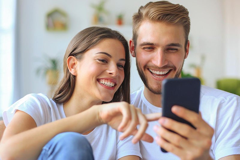 Een man zit ontspannen op een bank en bekijkt een dating app
